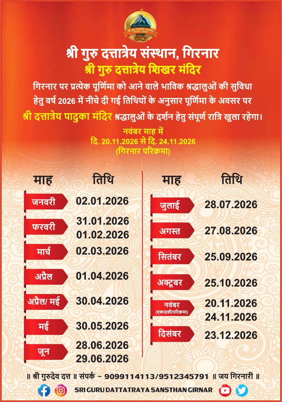 भारत के गुजरात प्रदेश में सौराष्ट्र प्रांत के जूनागढ़ शहर से लगभग 2 कि.मी. की दूरी पर एक भव्य और दिव्य पर्वत “गिरनार” विद्यमान है। गिरनार पर्वत की पाँचवी चोटी को गुरुशिखर के नाम से पहचाना जाता है, यहा भगवान दत्तात्रेयजी की चरण पादुका है,जिसके दर्शन के लिए लाखों की संख्या में श्रद्धालु देश विदेश से आकर के गिरनार का दर्शन करते है।